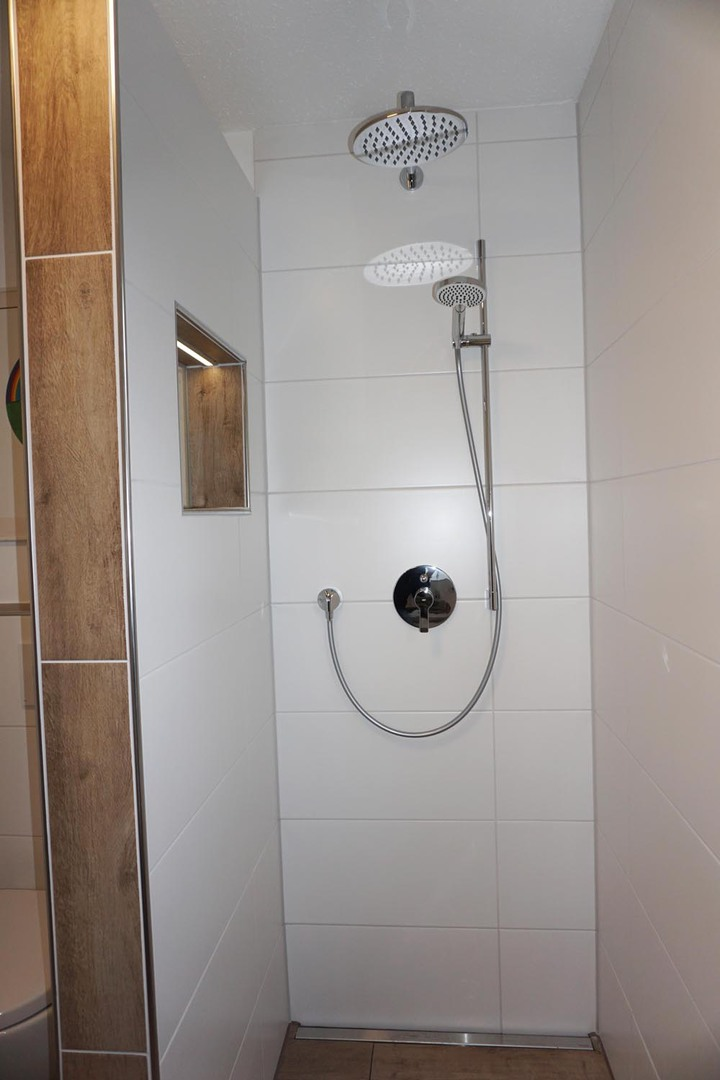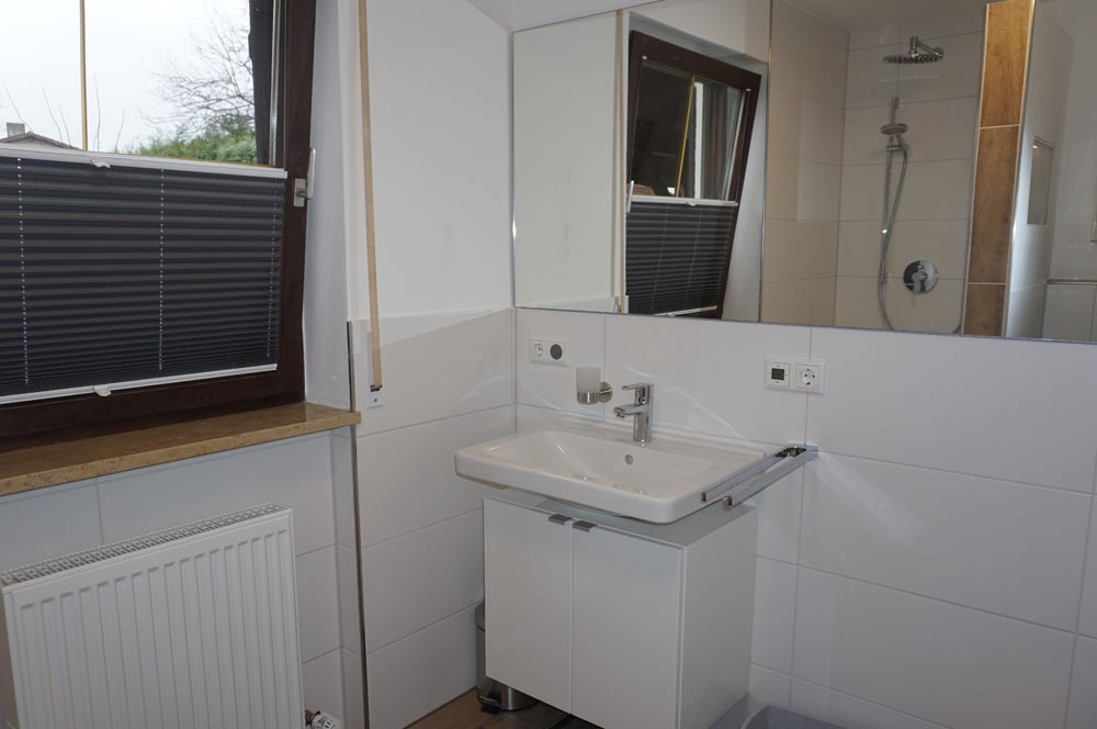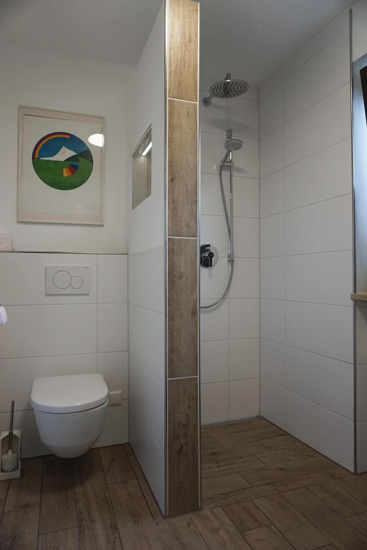 - Bad mit ebenbündiger Dusche und Handtüchern